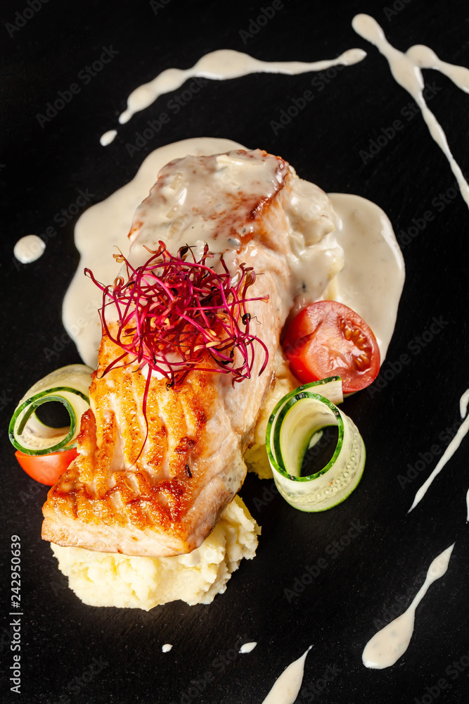 Fish steak from red fish salmon or trout, with a side dish of mashed potatoes, cherry tomatoes, cucumber and creamy sauce. Modern serving in the restaurant on a black slate blackboard.