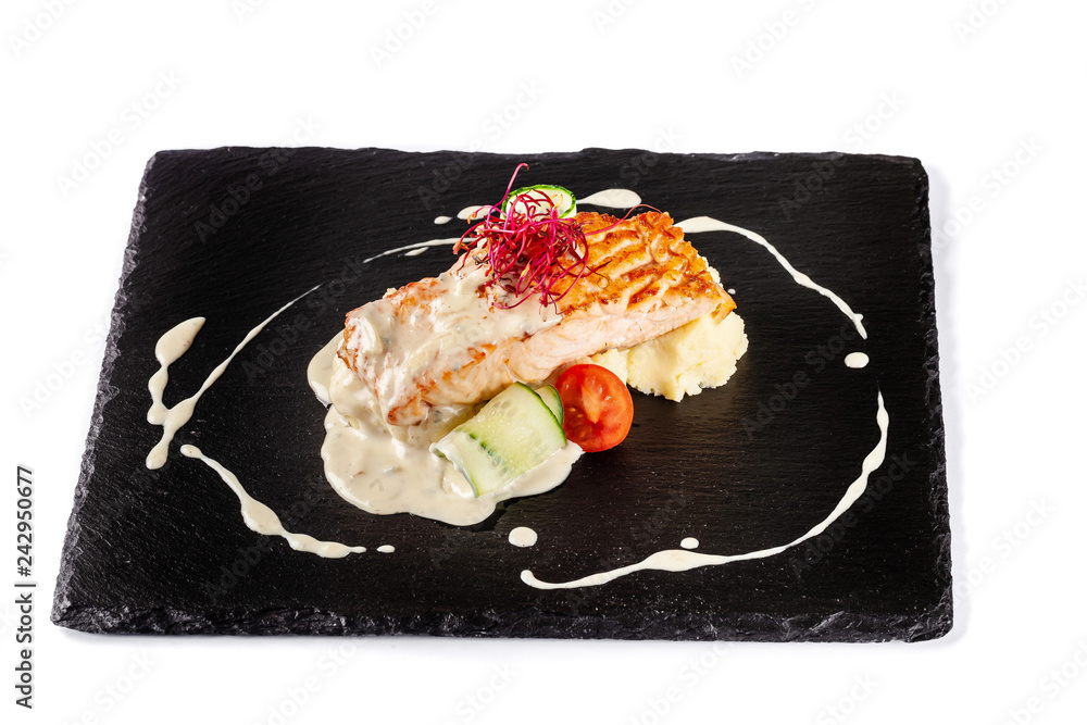 Fish steak from red fish salmon or trout, with a side dish of mashed potatoes, cherry tomatoes, cucumber and creamy sauce. Modern serving in the restaurant on a black slate blackboard.