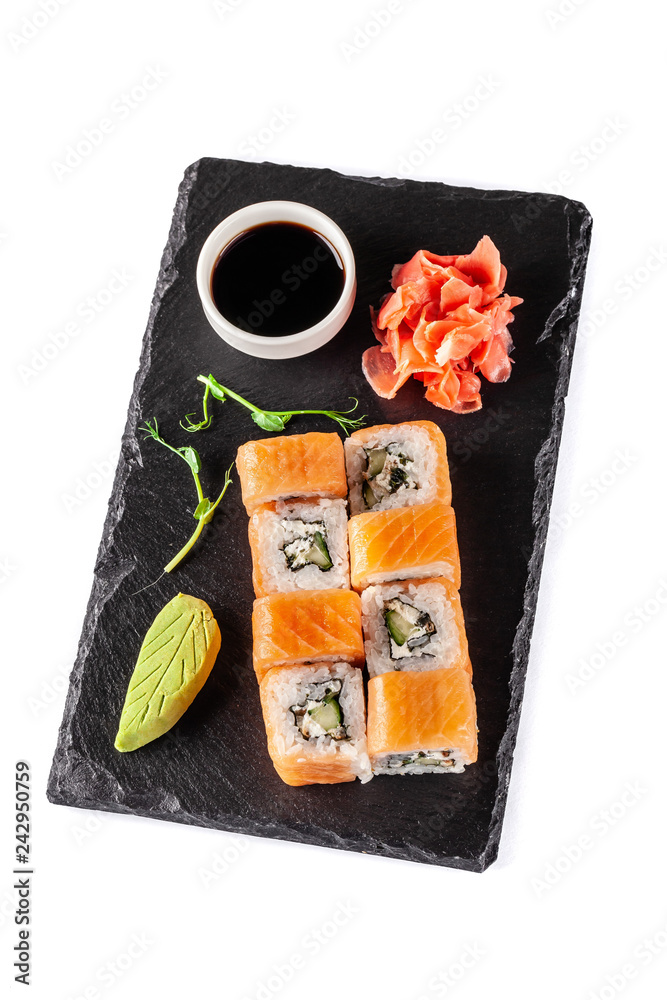 The concept of Japanese cuisine. Rolls with salmon, feta cheese, cucumber. Near soy sauce, ginger and wasabi. Modern serving dishes in the restaurant on a black slate blackboard. On a white background