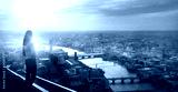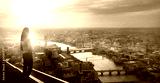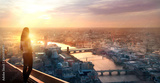 Young woman looking at the City of London at sunset. Planning the future, life and joy concept.