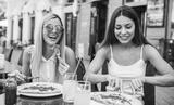 Pizza time. Young girls eating pizza in a cafe. Consumerism, lifestyle