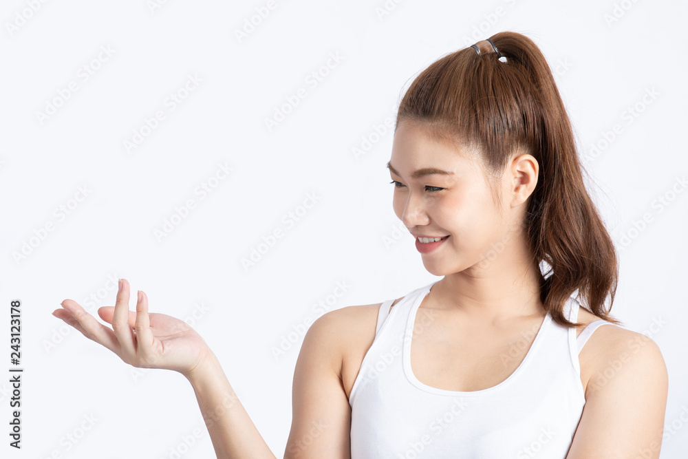 Beautiful Attractive Asian young women smile and pointing and open hand palm to copy space for display product feeling happiness and fun,Isolated on white background,Beauty Concept