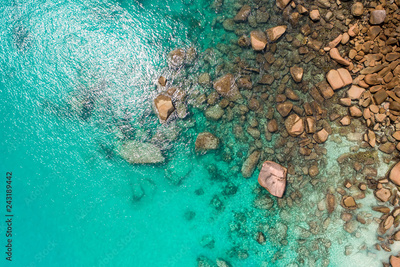 Aerial view of beautiful island at Seychelles in the Indian Ocean. Top view from drone