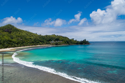Tropical beach with sea and palm taken from drone. Beach and sea photo. Romantic beach aerial view.