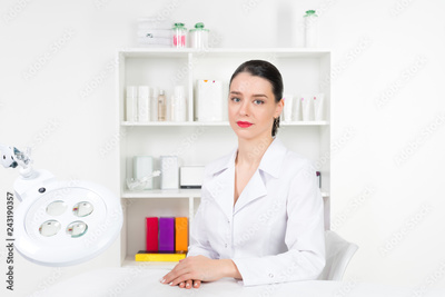 Woman beautician doctor at work in spa center. Portrait of a young female professional cosmetologist. Female employee in cosmetology cabinet or beauty parlor. Healthcare occupation, medical career