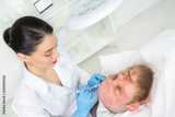 The doctor cosmetologist makes the Rejuvenating facial injections procedure for tightening and smoothing wrinkles on the face skin of a men in a beauty salon.Cosmetology skin care.