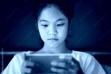 teenage girl sitting in bed playing a smartphone in social internet in the dark light under the blacket. The blue light has a negative effect on the child's eyes.