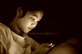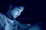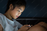teenage girl sitting in bed playing a smartphone in social internet in the dark light The blue light has a negative effect on the child's eyes.