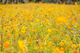Beautiful blooming yellow cosmos flower with clouds and blue sky. Landscape and botany image.
