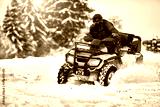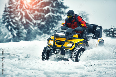 Winter walk on the quad bike in the forest.