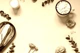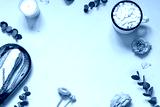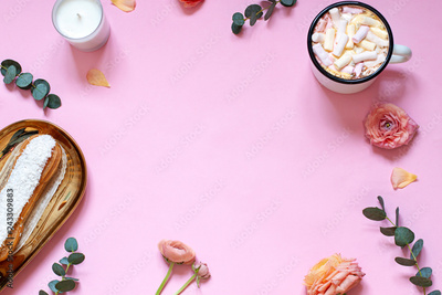 Floral conceptual frame on the pink background with cup of coffee and an eclair. Top view. Copy space