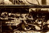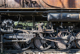 Old rusty wheels of the steam locomotive and the elements of the drive