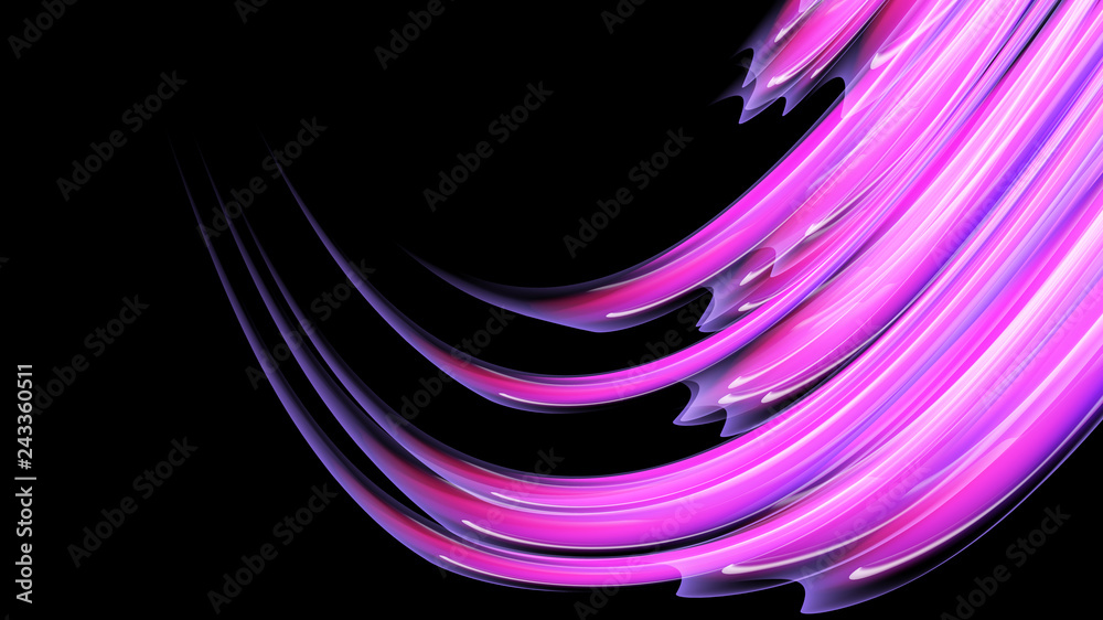 Beautiful bright motley purple pink abstract energetic magical cosmic fiery neon texture from lines and stripes, waves, flames with curves and twists on a black background and copy space. Vector