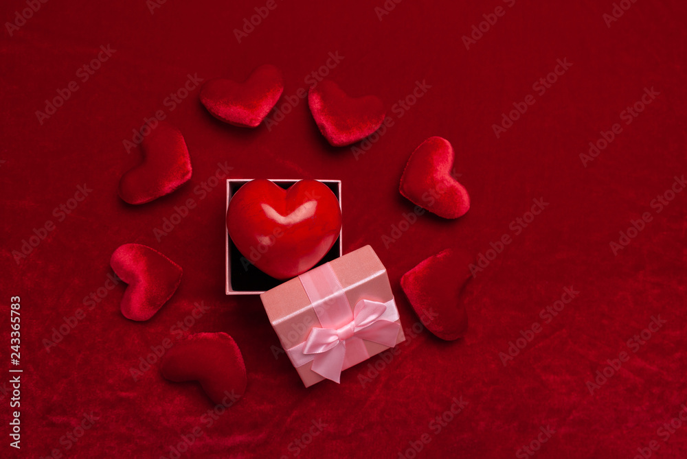 Gift or present box with red bow ribbon and glitter heart on red background for Valentines day
