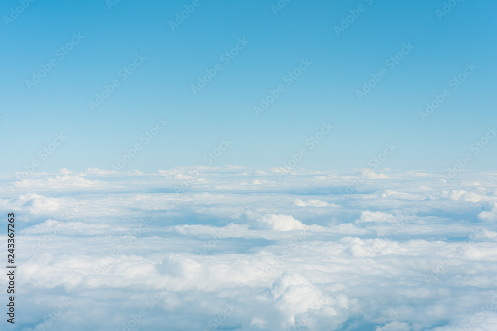 Top of cloud overcast blue sky, above cloudy skyline.