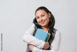 A young girl is a student of a high school student with a stack of textbooks in her hands. on white background