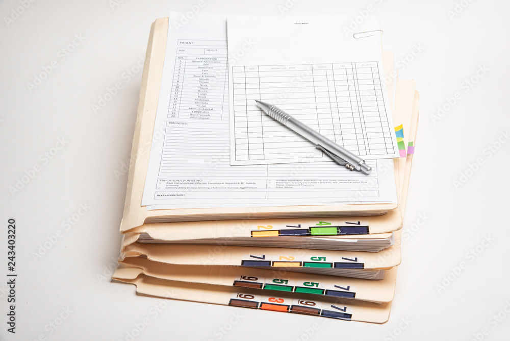A stack of color-coded and numbered patient medical records with blank doctor's office visit form, ledger card, and ballpoint pen.