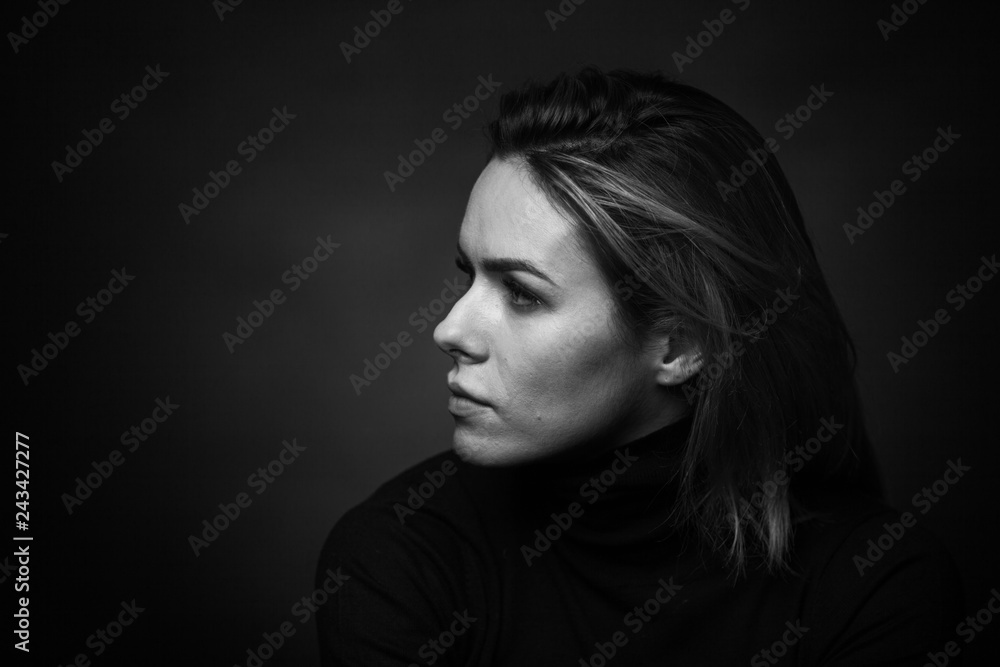 Dramatic black and white portrait of a beautiful woman on a dark background