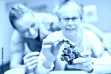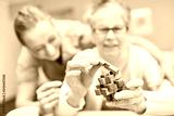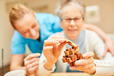 Senior Frau mit Demenz spielt mit Holzpuzzle