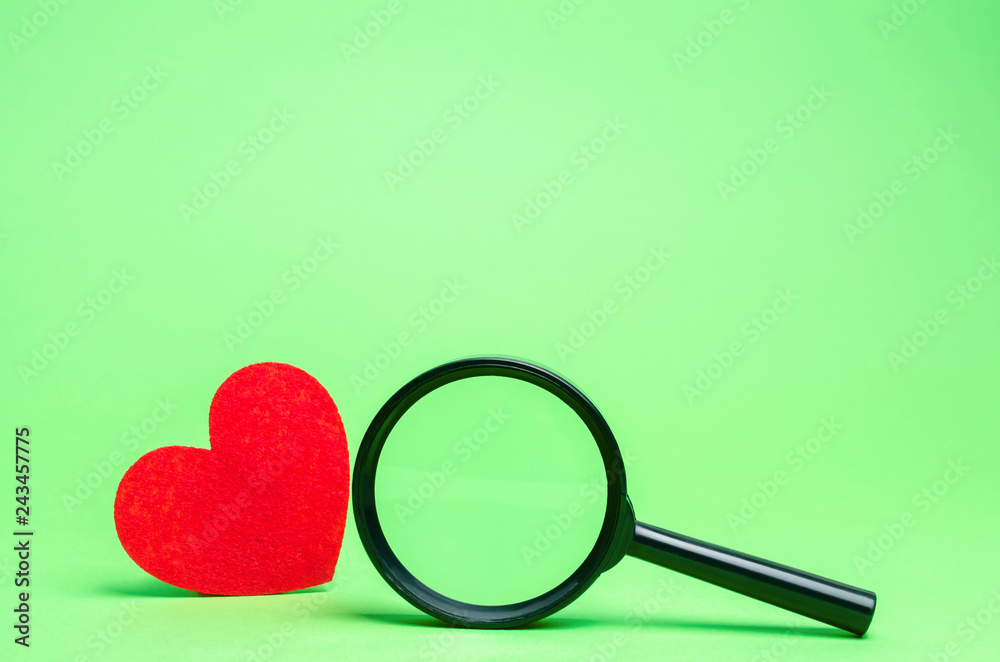 Red heart and magnifying glass. Concept of love and relationships. Search for love. Valentine's Day. Loneliness. Find a donor for blood transfusions. Medical concept. Charitable Foundation.