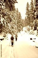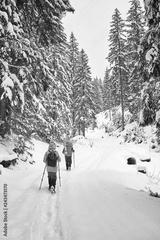 snow covered hiking trail in winter forest