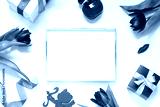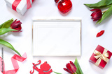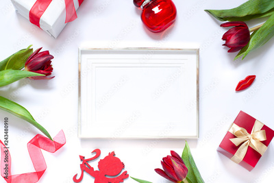 Valentines day concept frame flat lay on the white background with cupid and red flowers. Top view card. Copy space