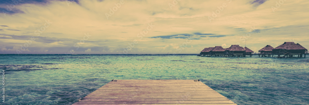 Tropical ocean banner. Luxury vacation paradise. Vintage tone.
