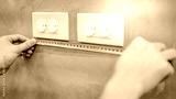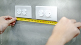 Male hand electrician using tape measure for measuring dimension of electrical outlet with safety cover on the wall. Electrical fixture installation and building construction concepts