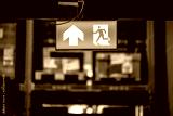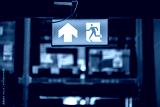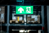 Green emergency exit sign or fire exit sign showing the way to escape with arrow symbol.