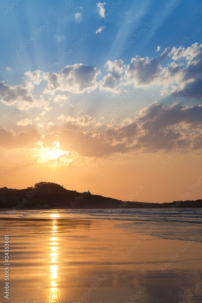 Nice sunset with lots of sunbeams at a lonely beach
