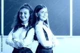 two brunette schoolgirls in school red uniforms are standing in a classroom with books