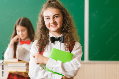 schoolgirl looking at the camera and smiling.two schoolgirls stand in a classroom with books.
