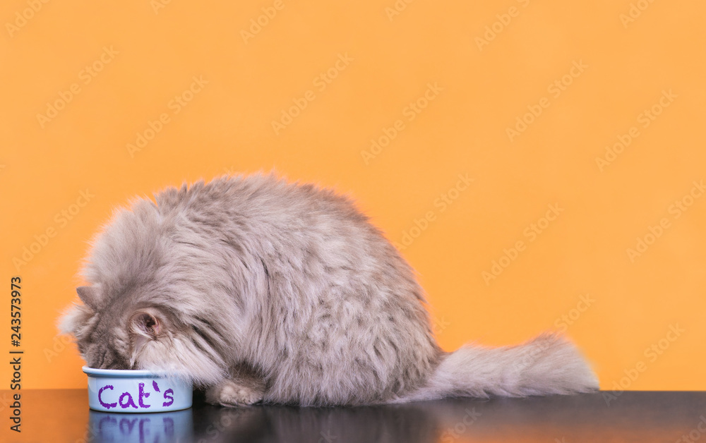 Portrait of a fluffy cat that eats pet food on a pink background. Plate with food and a gray adult cat that eats food for cats, isolated on a orange pastel background.