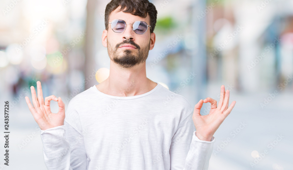 Young handsome man wearing sunglasses over isolated background relax and smiling with eyes closed doing meditation gesture with fingers. Yoga concept.