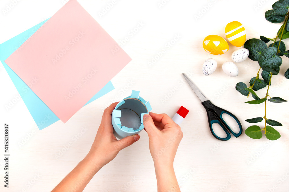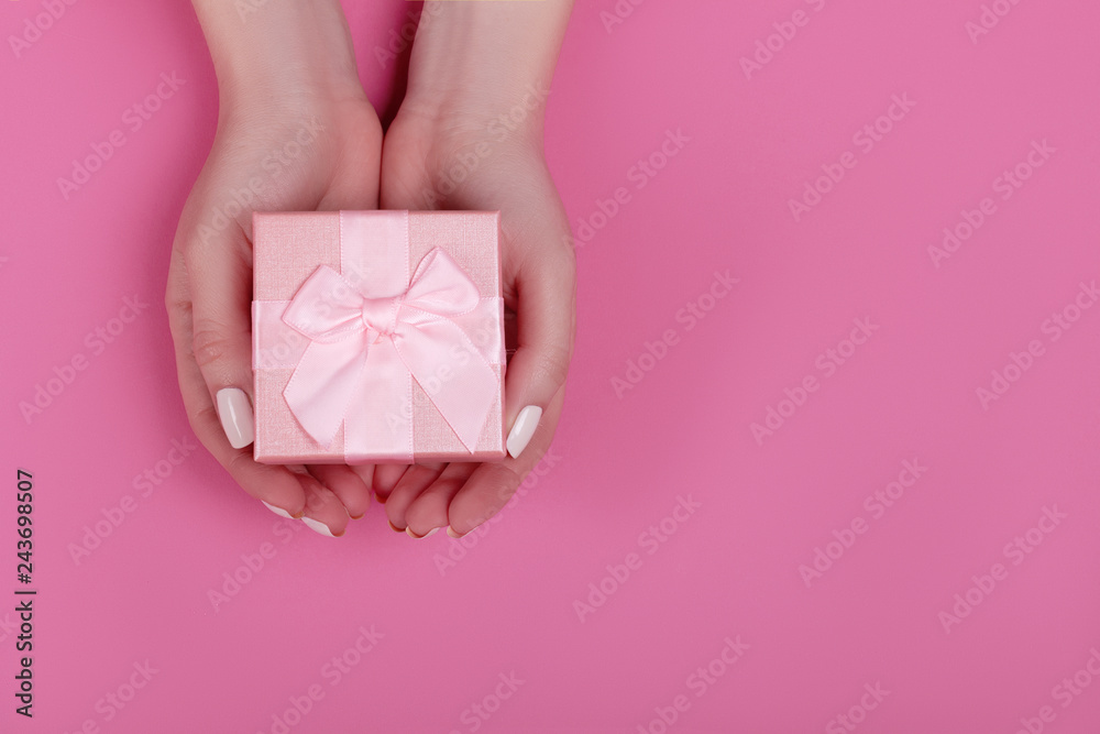 top view hand woman holding pink gift box for valentines day on pink pastel color background