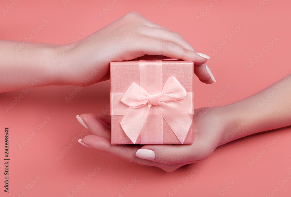 top view hand woman holding pink gift box for valentines day on pink pastel color background