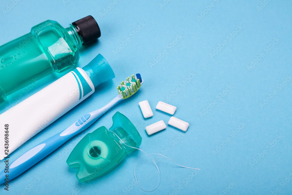 Tools for dental care: orthodontic brush, floss, toothpaste. Invisible dental aligners modern tooth brackets transparent braces to straighten teeth in cosmetic dentistry and orthodontics