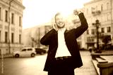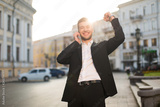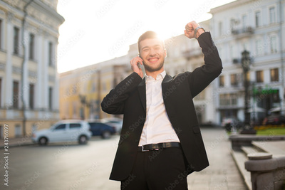 Young smiling man in black jacket and white shirt happily raising hand up while talking on cellphone with beautiful city view on background