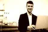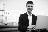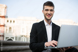 Young handsome smiling businessman in classic black jacket and white shirt with wireless earphones happily looking in camera with laptop in hands while spending time outdoor