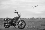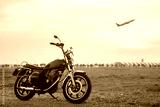 Vintage motorcycle with blurry plane at sunset.