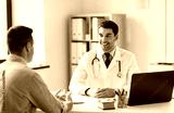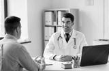 medicine, healthcare and people concept - smiling doctor talking to male patient at medical office in hospital