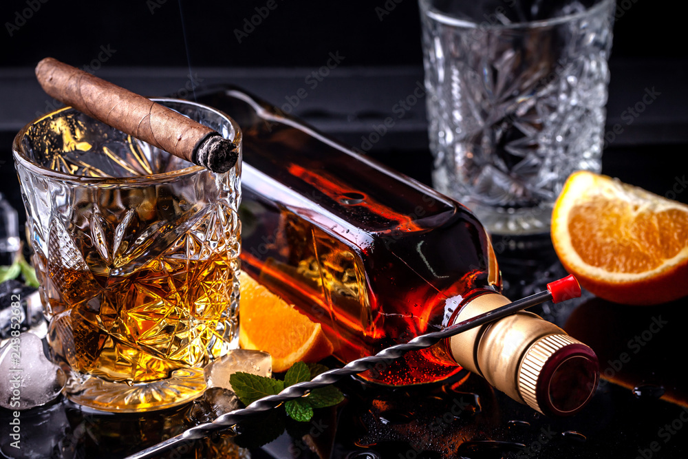 concept of alcoholism, loneliness, dependence. A bottle of whiskey, a glass of whiskey and with ice, a cigar with smoke on a black table, on a black background. Elite drink for masculine relaxation