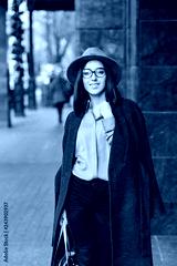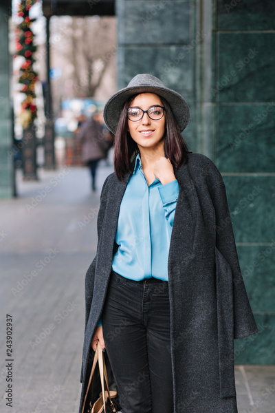 Fashionable joyful young business woman in black glasses walking on street in big city. Blue shirt, grey coat, hat, luxury clothes, elegant look, smiling to side, true emotions