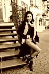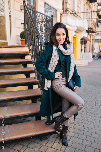 Fashionable joyful young woman on heels near stairs on street. Stylish long green coat, cut brunette hair, white knitted scarf, modern outlook, expressing positive emotions, smiling