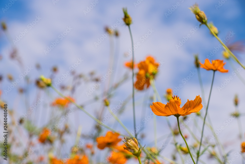Beautiful blooming yellow cosmos flower with clouds and blue sky. Landscape and botany image.