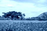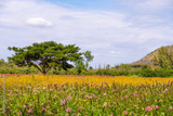 Beautiful blooming yellow cosmos flower with clouds and blue sky. Landscape and botany image.