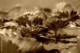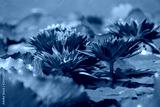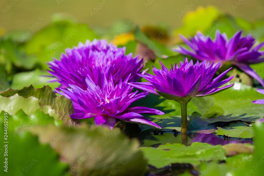 Beautiful of violet water lily or lotus with yellow pollen on surface of water in pond. Side view and peace concept.