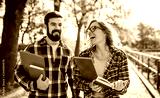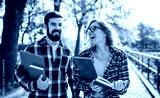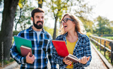 Couple of students with a books walking through the park. Education, love, dating, lifestyle concept