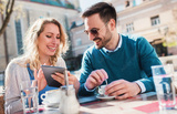Young couple sitting in the cafe and having fun with tablet. Dating, relationships, love, romance, lifestyle, technology