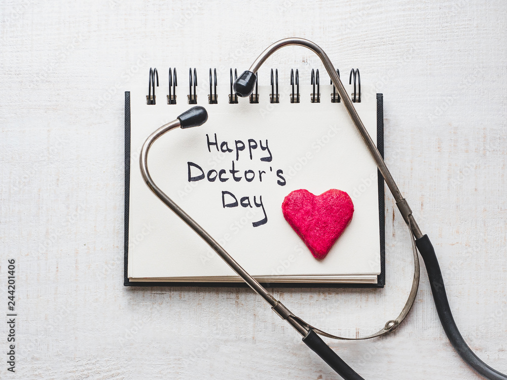 Happy National Doctor's Day. Beautiful card. Sketchbook with congratulatory inscription. Isolated background, wooden surface. Congratulations for loved ones, relatives, friends and colleagues